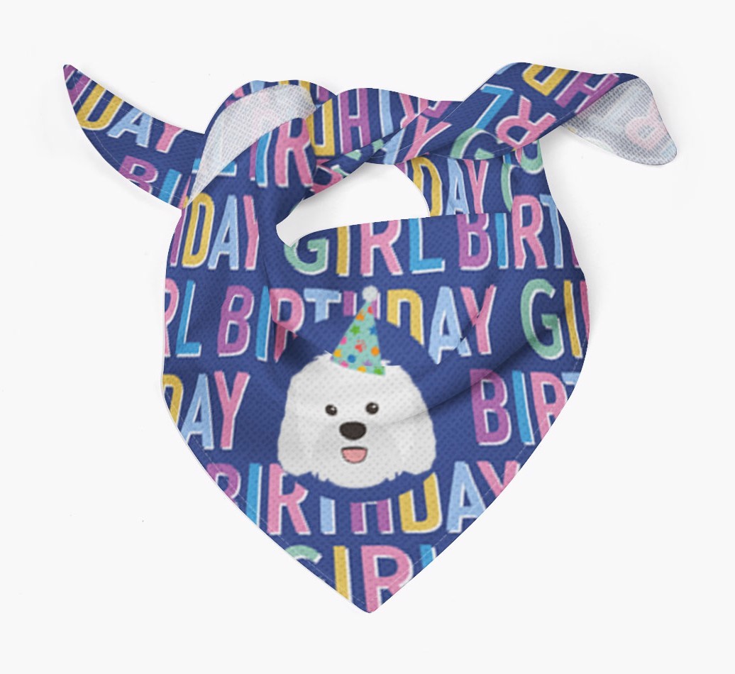 Featuring a text pattern that reads 'birthay girl' and personalized with Sheepadoodle's cute icon (complete with a fun party hat), your Sheepadoodle will look simply pawgeous on their special day when they're wearing this bandana.