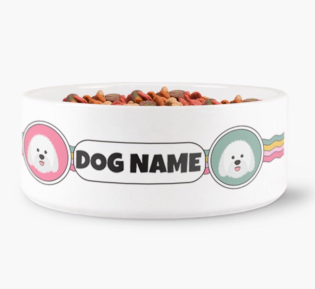 This jazzy dog bowl is sure to make waves with Sheepadoodle! With a colorful wavy pattern, this bowl is personalized with adorable Sheepadoodle icons and Sheepadoodle’s name to make it extra special.