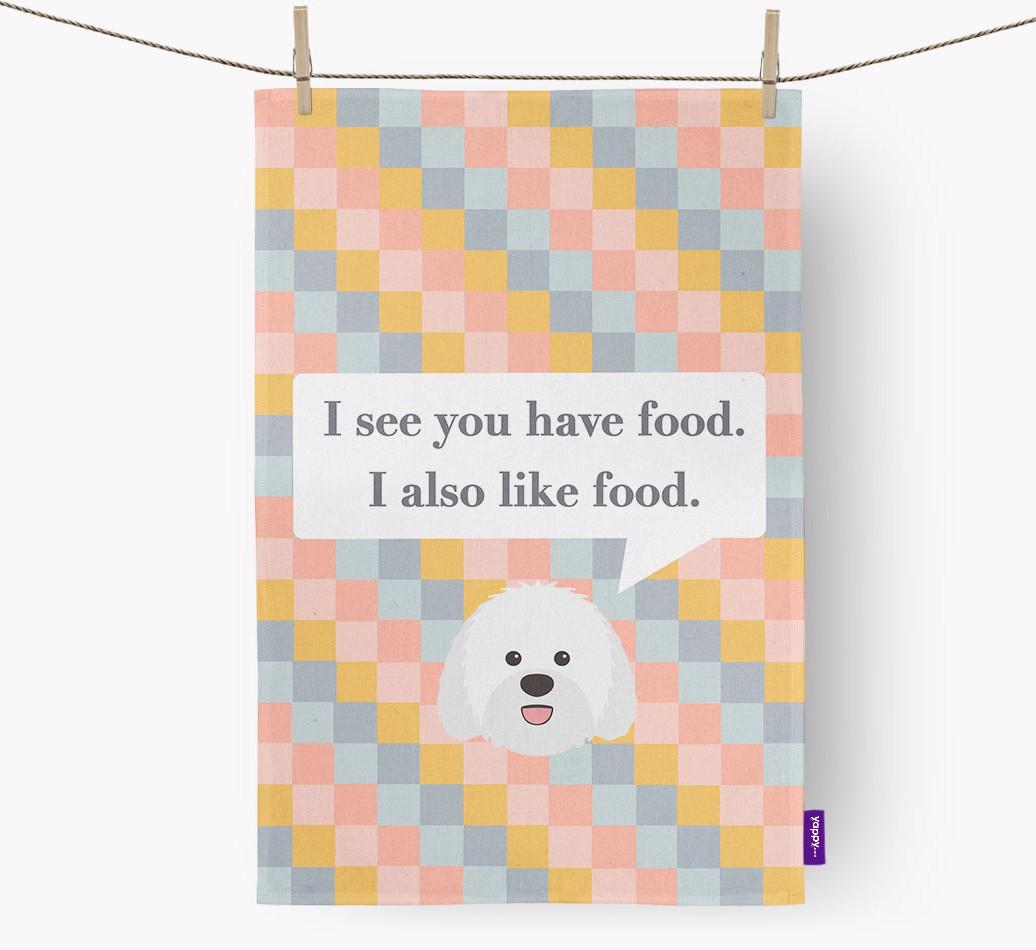 If your Sheepadoodle is a full time snack machine, this dish towel may be the ideal way to warn your guests.