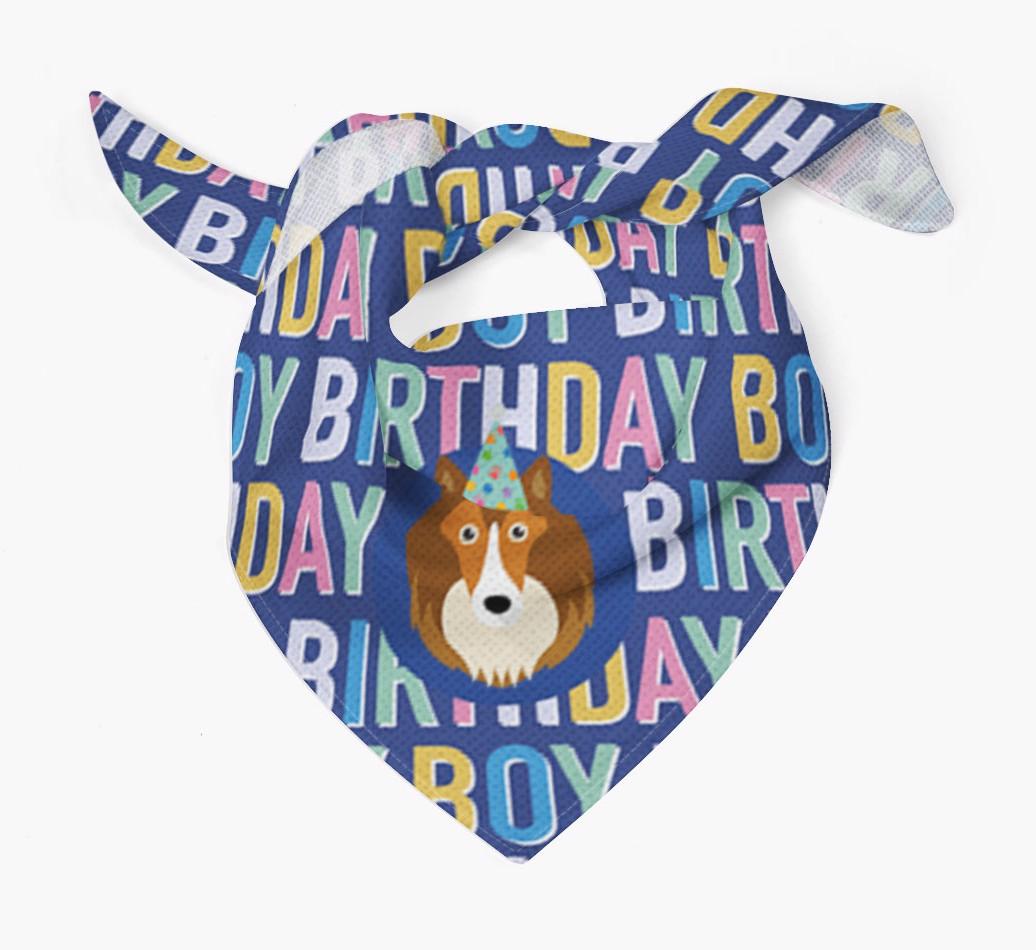 Featuring a colorful text pattern that reads 'birthay boy' and personalized with Shetland Sheepdog's cute icon (complete with a fun party hat), your Sheltie will look simply pawgeous on their special day when they're wearing this bandana.