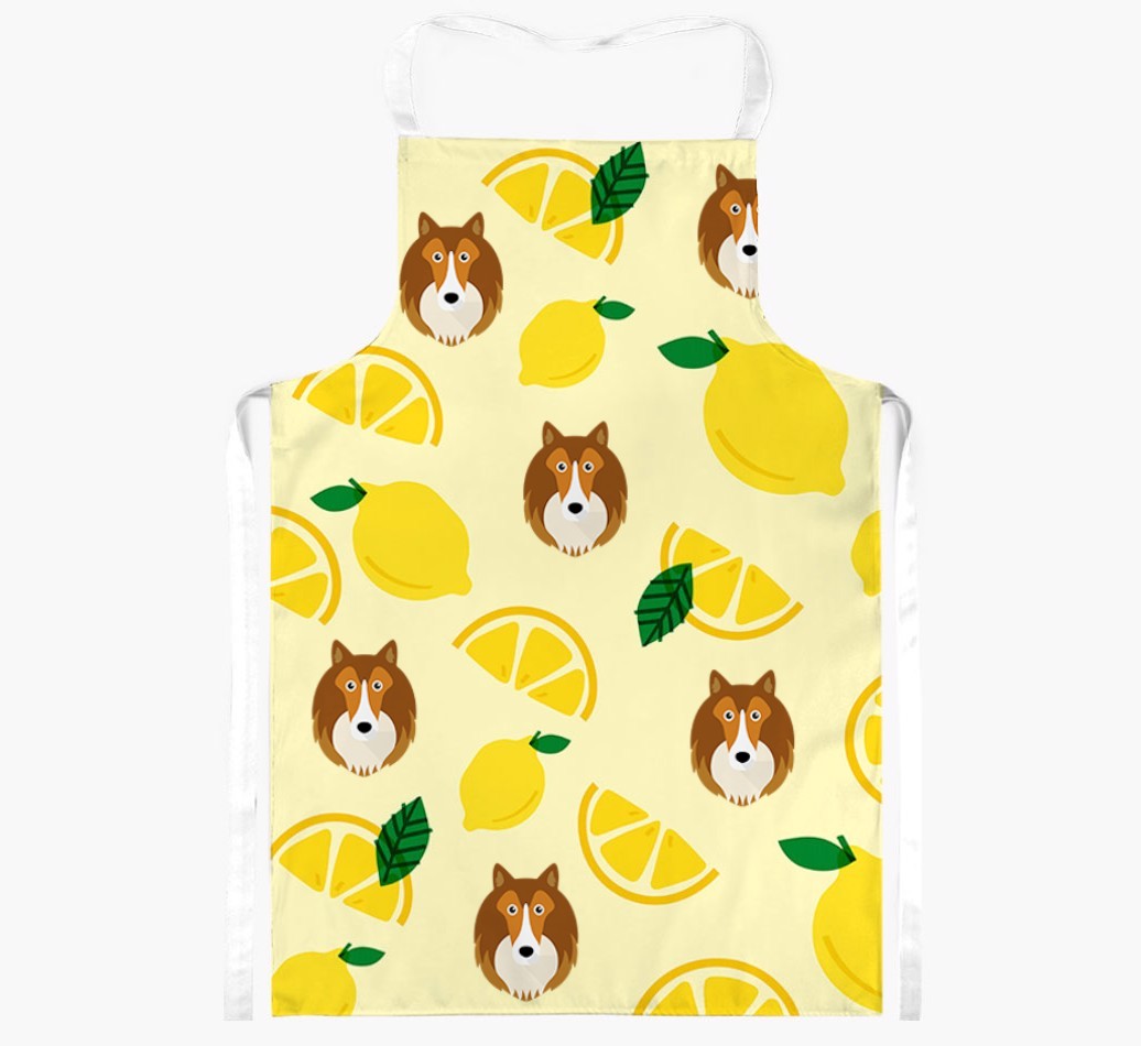 Fruity and fabulous, this apron is extra special as it features your Shetland Sheepdog!