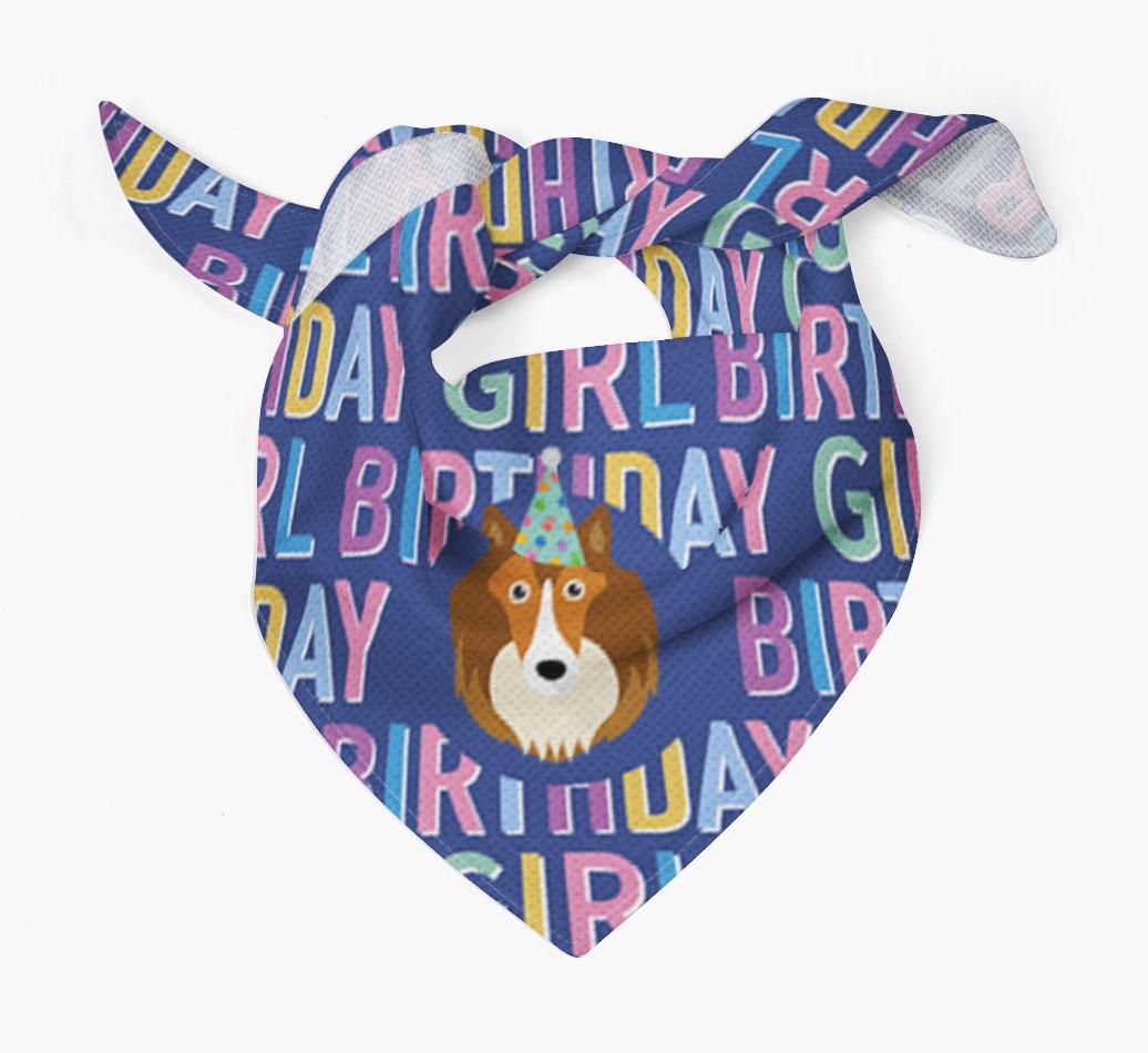 Featuring a text pattern that reads 'birthay girl' and personalized with Shetland Sheepdog's cute icon (complete with a fun party hat), your Sheltie will look simply pawgeous on their special day when they're wearing this bandana.