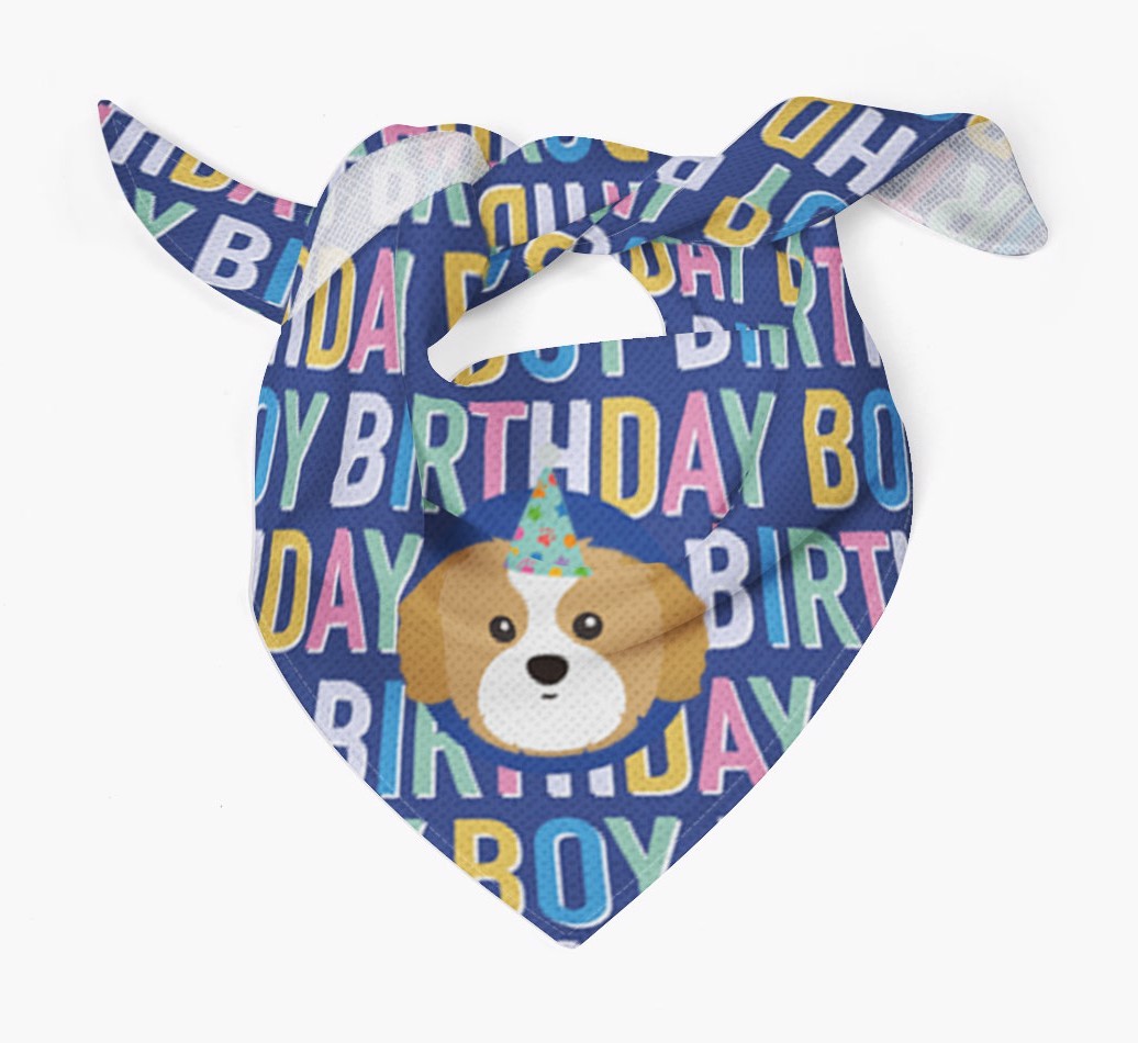 Featuring a colorful text pattern that reads 'birthay boy' and personalized with Shih Tzu's cute icon (complete with a fun party hat), your Shih Tzu will look simply pawgeous on their special day when they're wearing this bandana.