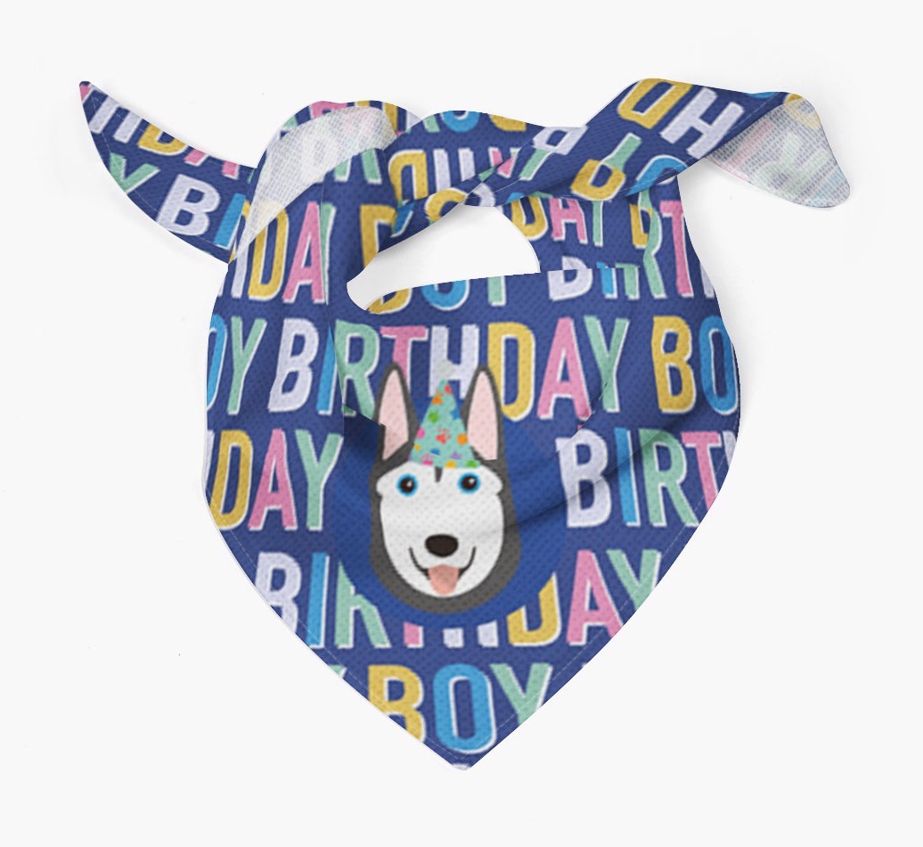 Featuring a colorful text pattern that reads 'birthay boy' and personalized with Siberian Husky's cute icon (complete with a fun party hat), your Husky will look simply pawgeous on their special day when they're wearing this bandana.