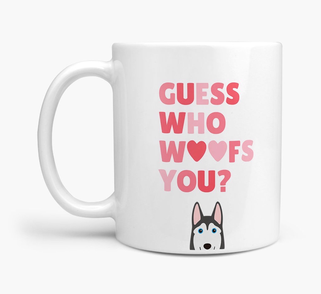 Personalized with Siberian Husky's cute face, this adorable mug is perfect for showing off the one who "woofs" you - how sweet!
