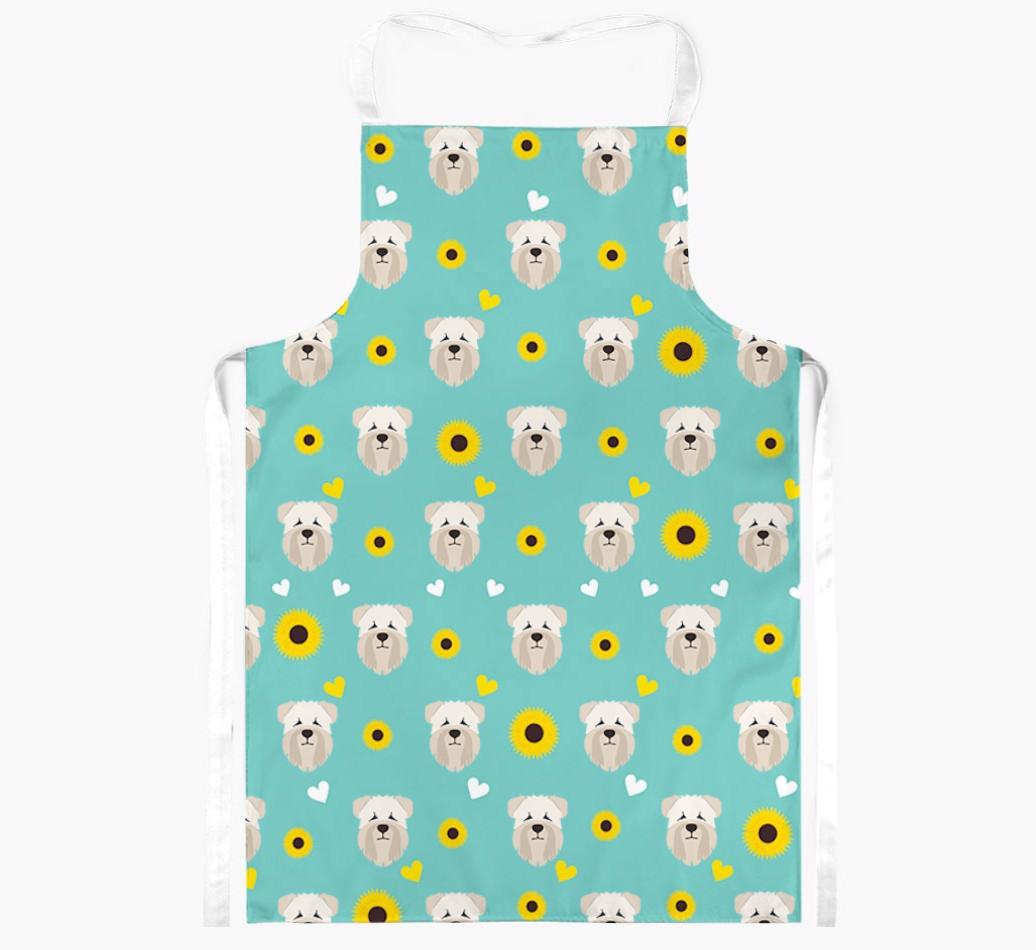 This apron has a delightful sunflower and heart pattern, and best of all - it's personalized with Soft Coated Wheaten Terrier's face too! This cute and colorful apron is sure to put a smile on every dog lover's face.