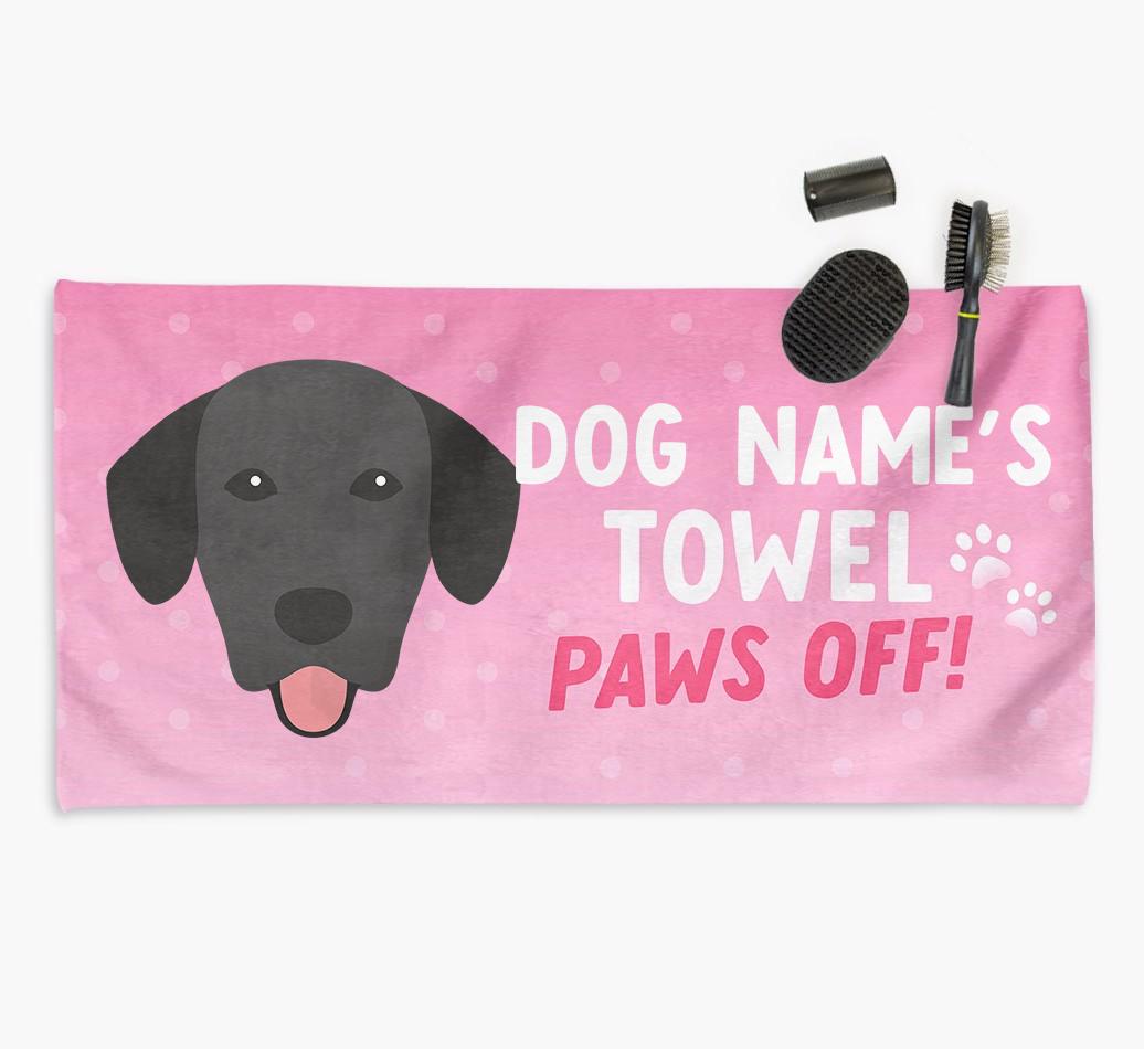 Perfect for messy pups and for pampering your Springador at bathtime, this soft and absorbent towel is made for cleaning your mucky pup and drying them off in a flash. It's personalized with Springador's name and icon and is printed with a message for everyone else to keep their paws off it!