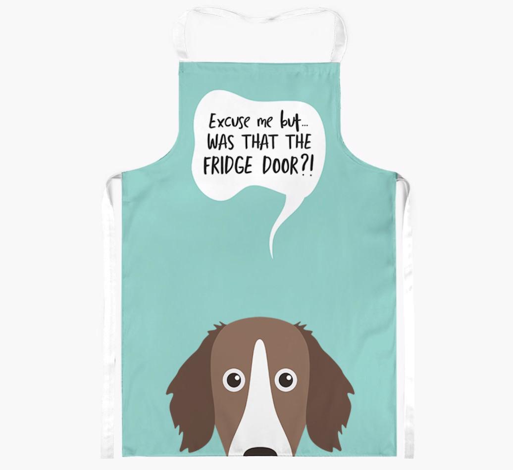 Featuring your hungry hound's cheeky icon and available in five eye-catching colors, this apron is a must-have for parents of greedy pups!