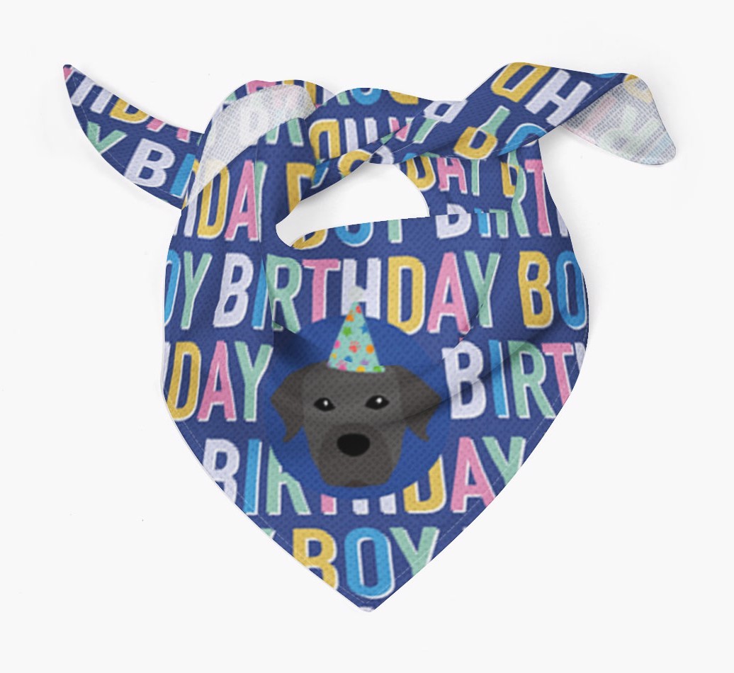 Featuring a colorful text pattern that reads 'birthay boy' and personalized with Staffador's cute icon (complete with a fun party hat), your Staffador will look simply pawgeous on their special day when they're wearing this bandana.