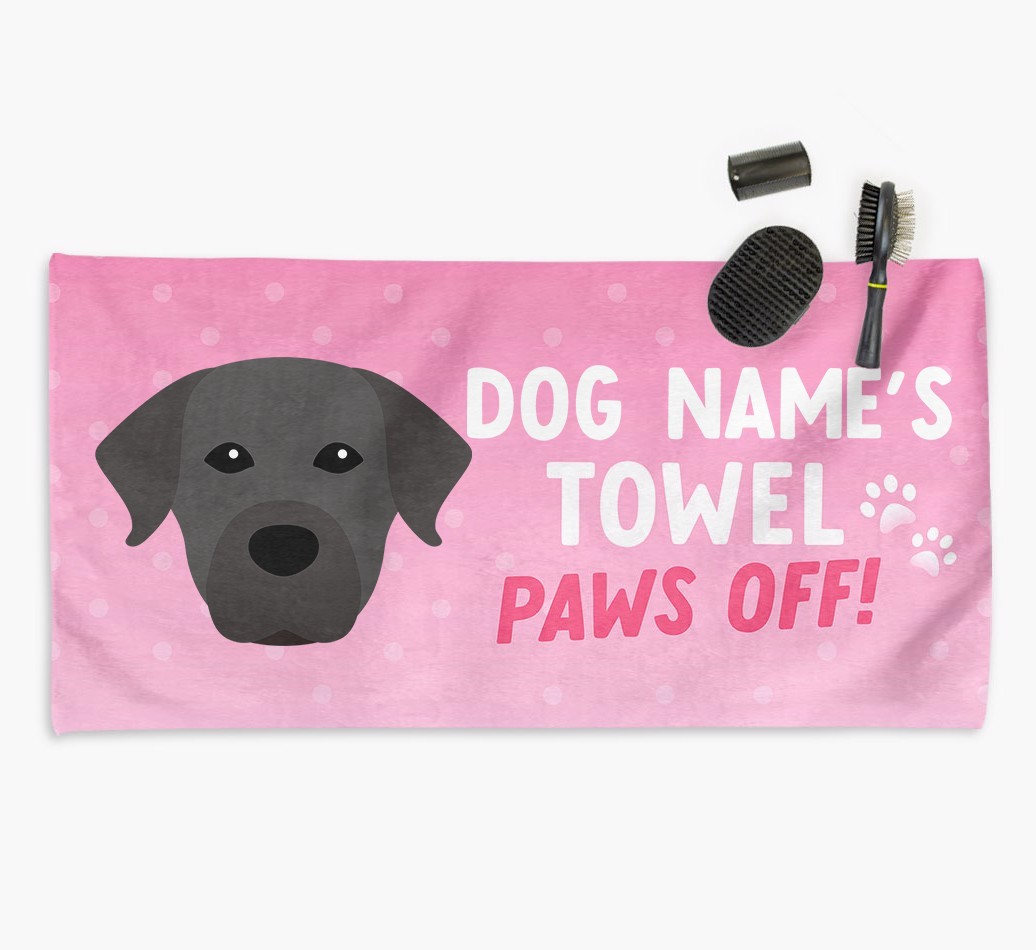 Perfect for messy pups and for pampering your Staffador at bathtime, this soft and absorbent towel is made for cleaning your mucky pup and drying them off in a flash. It's personalized with Staffador's name and icon and is printed with a message for everyone else to keep their paws off it!