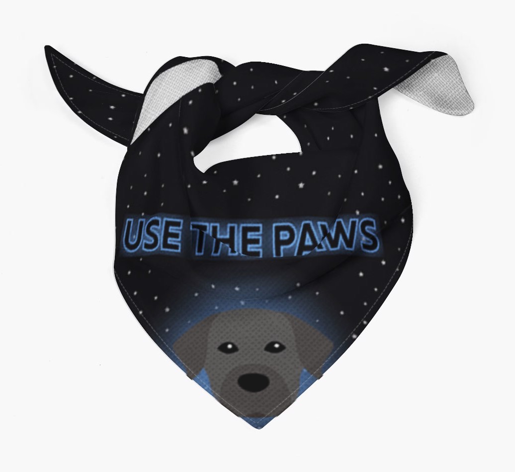 Featuring a starry night sky and glowing text, this bandana is made extra special with the addition of your Staffador's cute icon.