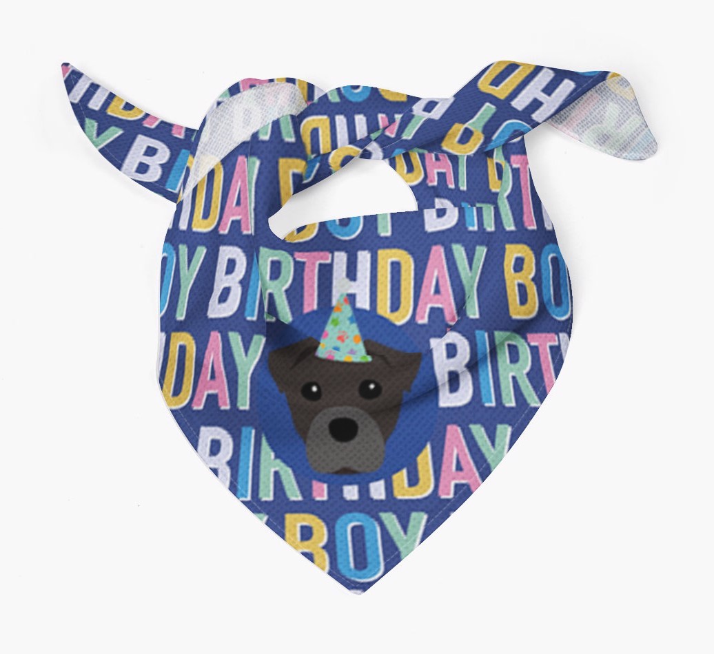 Featuring a colorful text pattern that reads 'birthay boy' and personalized with Staffy Jack's cute icon (complete with a fun party hat), your Staffy Jack will look simply pawgeous on their special day when they're wearing this bandana.