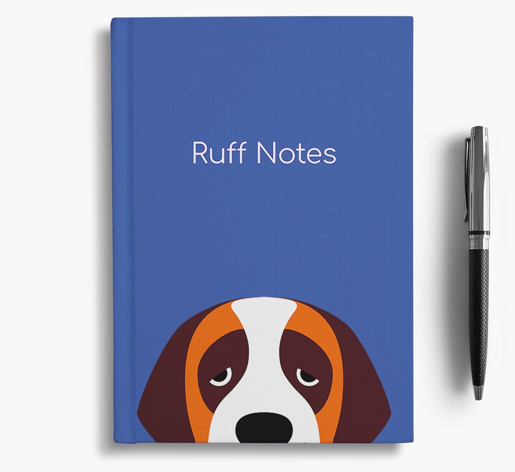 The front cover features our exclusive St. Bernard peeking icon and is printed with the words, ‘Ruff Notes’, whilst the back is printed with the words ‘Live. Laugh. Woof.’.