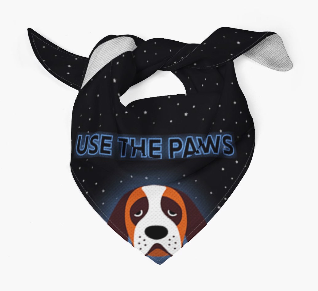 Featuring a starry night sky and glowing text, this bandana is made extra special with the addition of your St. Bernard's cute icon.