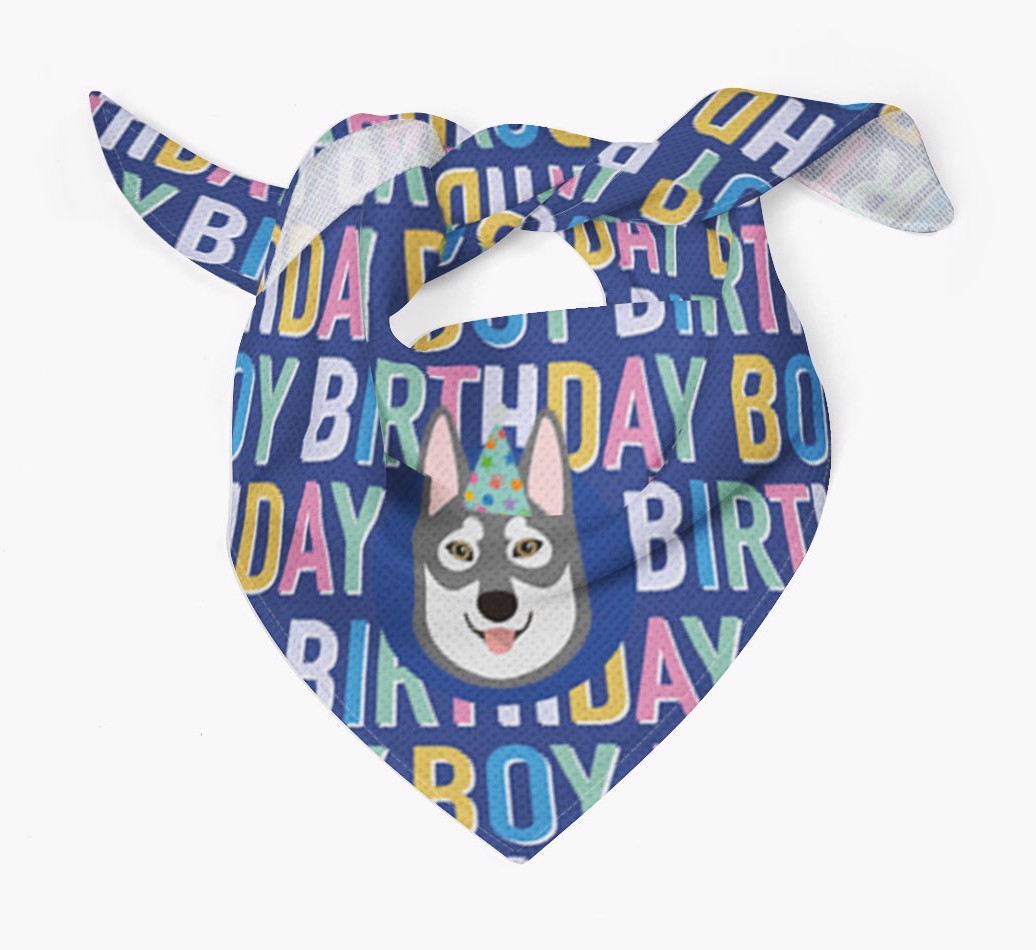 Featuring a colorful text pattern that reads 'birthay boy' and personalized with Tamaskan's cute icon (complete with a fun party hat), your Tamaskan will look simply pawgeous on their special day when they're wearing this bandana.