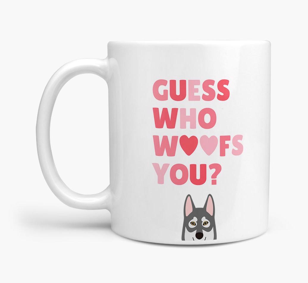 Personalized with Tamaskan's cute face, this adorable mug is perfect for showing off the one who "woofs" you - how sweet!
