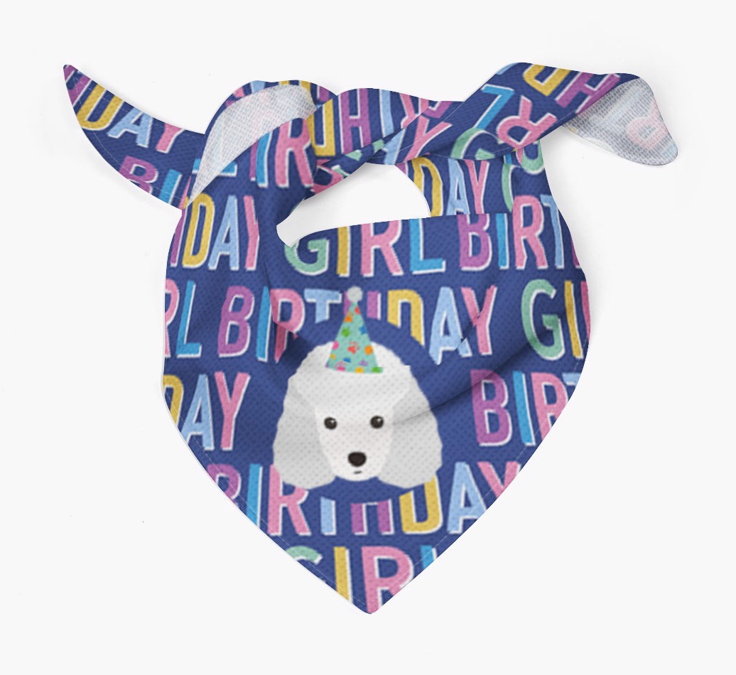 Featuring a text pattern that reads 'birthay girl' and personalized with Toy Poodle's cute icon (complete with a fun party hat), your Toy Poodle will look simply pawgeous on their special day when they're wearing this bandana.