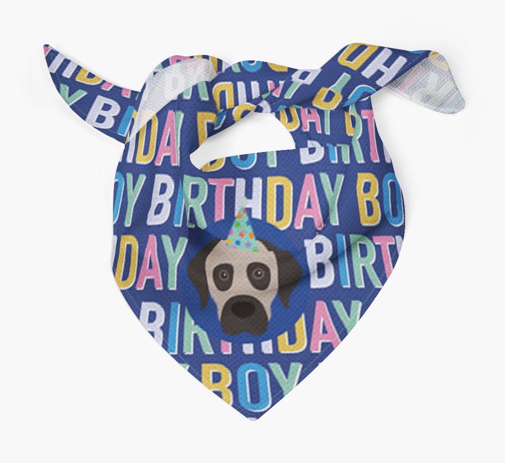 Featuring a colorful text pattern that reads 'birthay boy' and personalized with Turkish Kangal Dog's cute icon (complete with a fun party hat), your Kangal will look simply pawgeous on their special day when they're wearing this bandana.