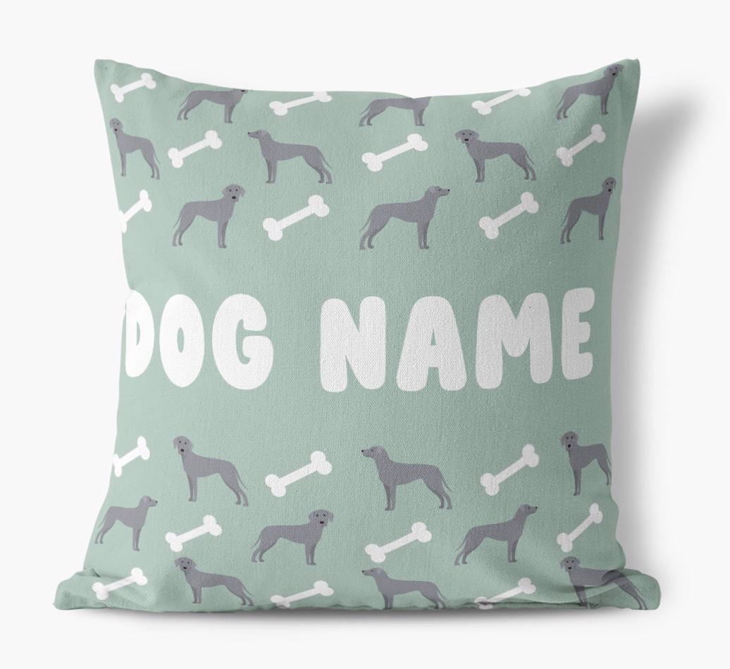 Personalized with Weimaraner’s name against a background of Weimaraner icons and bones, this gorgeous pillow is full of pawsonality.