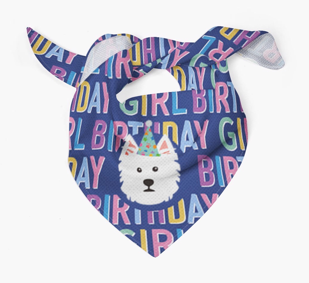 Featuring a text pattern that reads 'birthay girl' and personalized with West Highland White Terrier's cute icon (complete with a fun party hat), your Westie will look simply pawgeous on their special day when they're wearing this bandana.