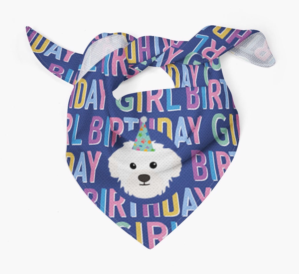 Featuring a text pattern that reads 'birthay girl' and personalized with Westiepoo's cute icon (complete with a fun party hat), your Westiepoo will look simply pawgeous on their special day when they're wearing this bandana.