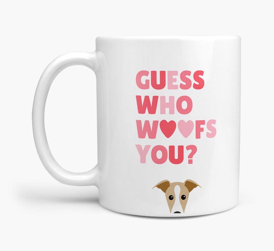 Personalized with Whippet's cute face, this adorable mug is perfect for showing off the one who "woofs" you - how sweet!