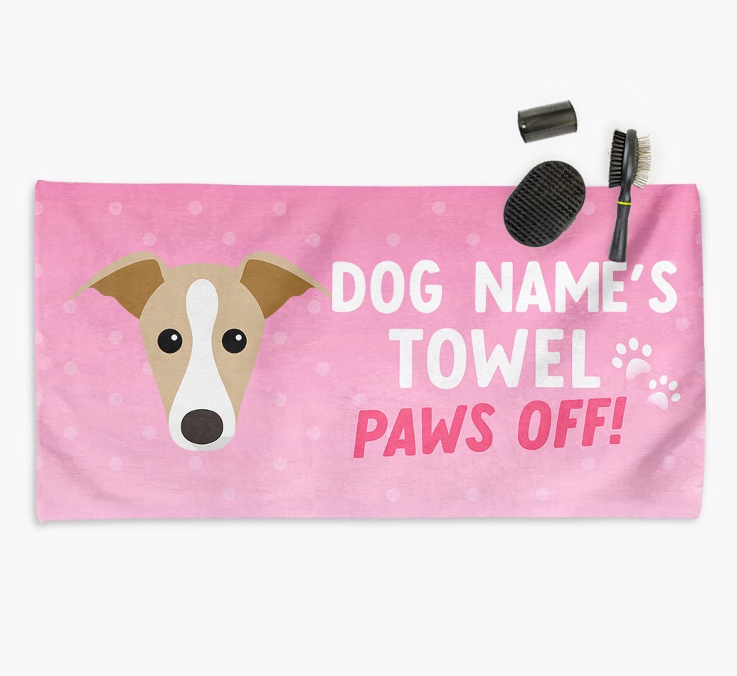 Perfect for messy pups and for pampering your Whippet at bathtime, this soft and absorbent towel is made for cleaning your mucky pup and drying them off in a flash. It's personalized with Whippet's name and icon and is printed with a message for everyone else to keep their paws off it!