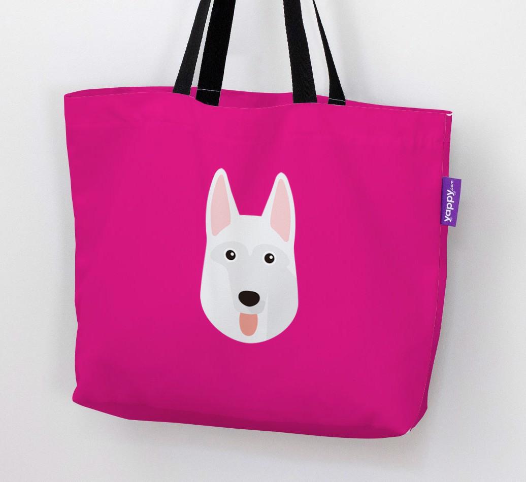 This Canvas Bag features an exclusive White Swiss Shepherd Dog icon printed on a bright, bold background.