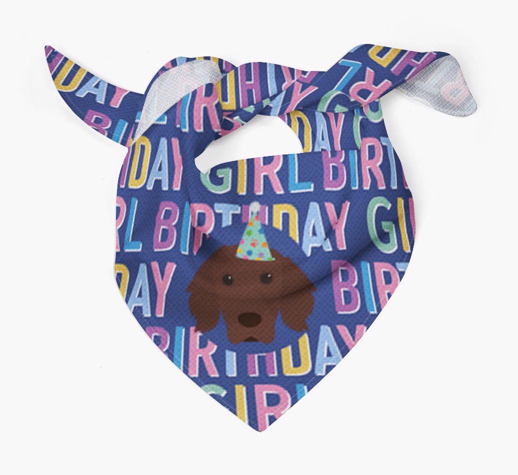 Featuring a text pattern that reads 'birthay girl' and personalized with Working Cocker Spaniel's cute icon (complete with a fun party hat), your Cocker will look simply pawgeous on their special day when they're wearing this bandana.