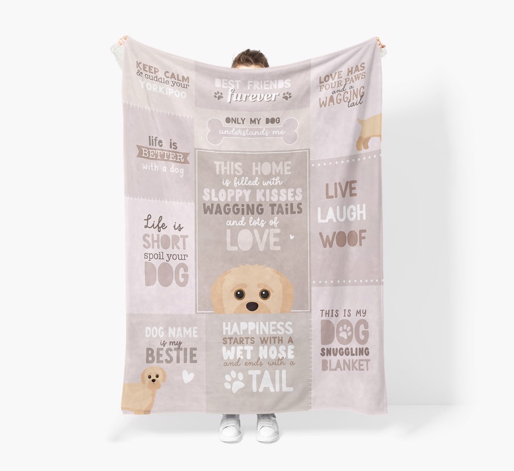 Made from luxuriously soft sherpa fleece material, this blanket is guaranteed to keep you cosy and snug, pawfect night with Yorkipoo.
