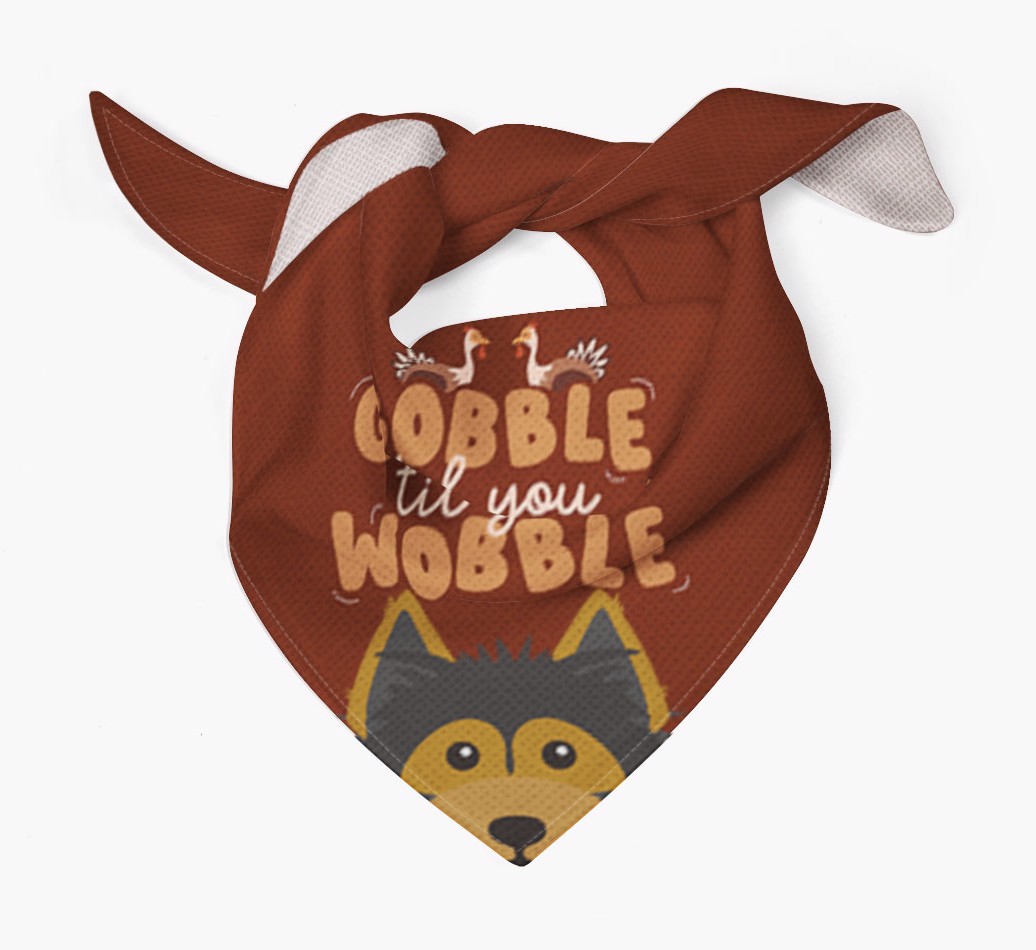 This cute custom bandana is printed with the phrase of the season, "gobble til you wobble"!