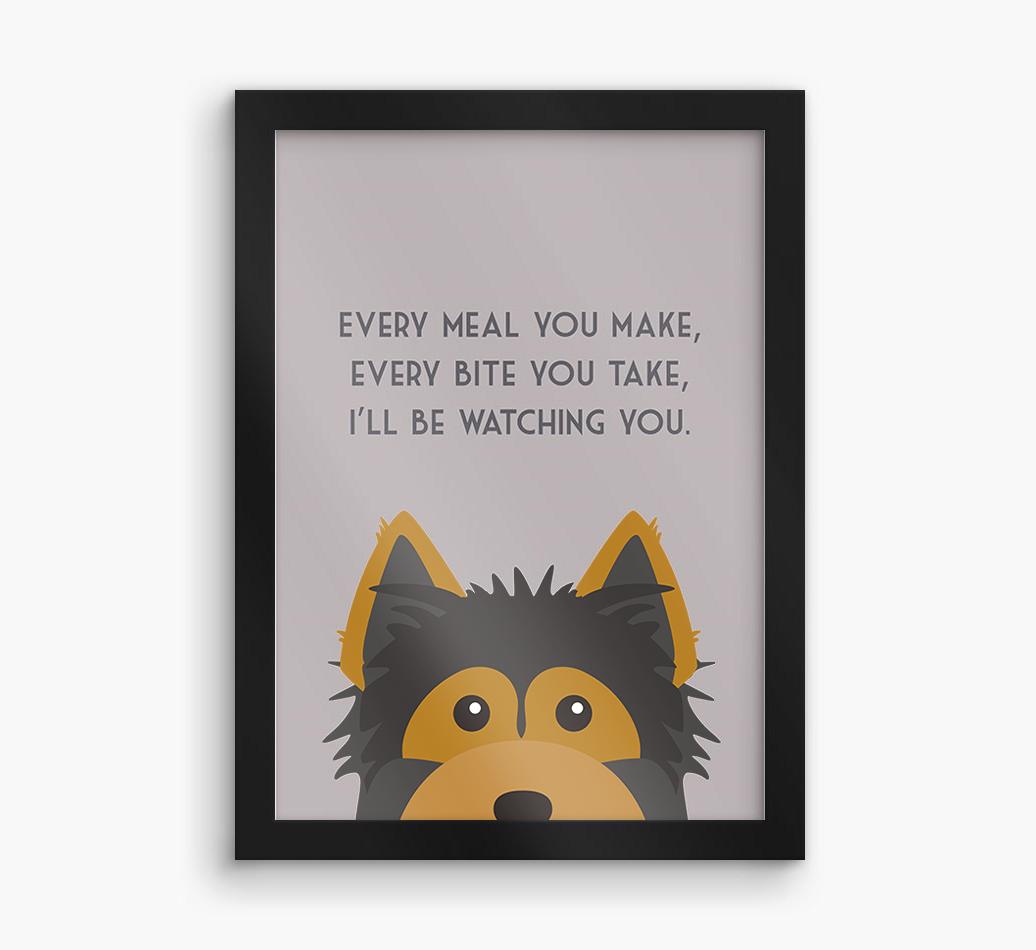 Printed with the words, ‘Every meal you make, every bite you take, I’ll be watching you’ and complete with our cute Yorkie peeking from the bottom of the design, this artwork will look great on display in the kitchen or anywhere Yorkshire Terrier likes to watch you eat!
