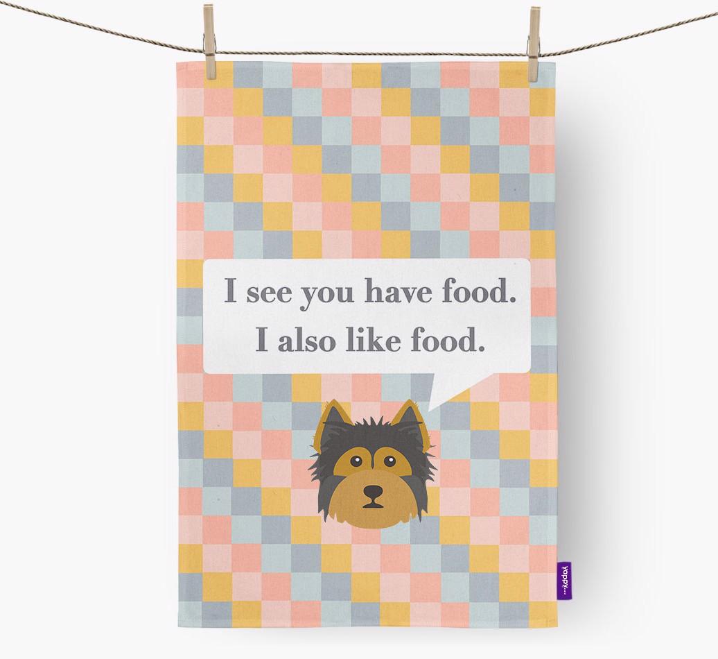 If your Yorkshire Terrier is a full time snack machine, this dish towel may be the ideal way to warn your guests.